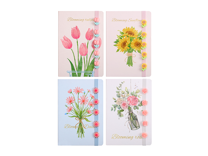 Flower Print A5 Notebook with Elastic Strap and Flower Shape Buttons - 21x14.5cm - ST2013